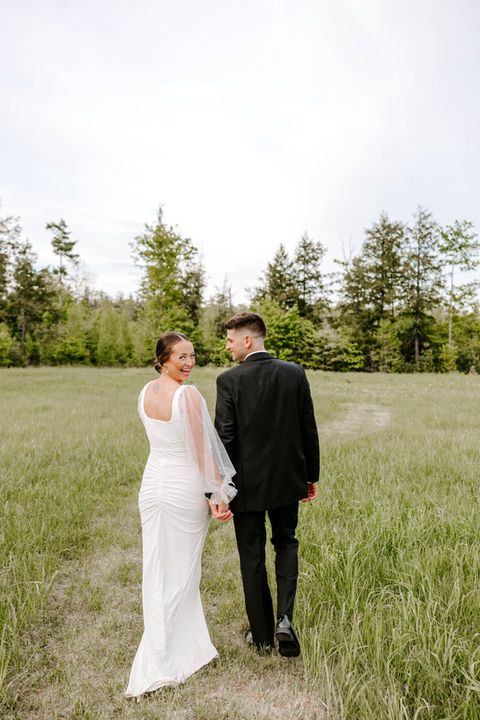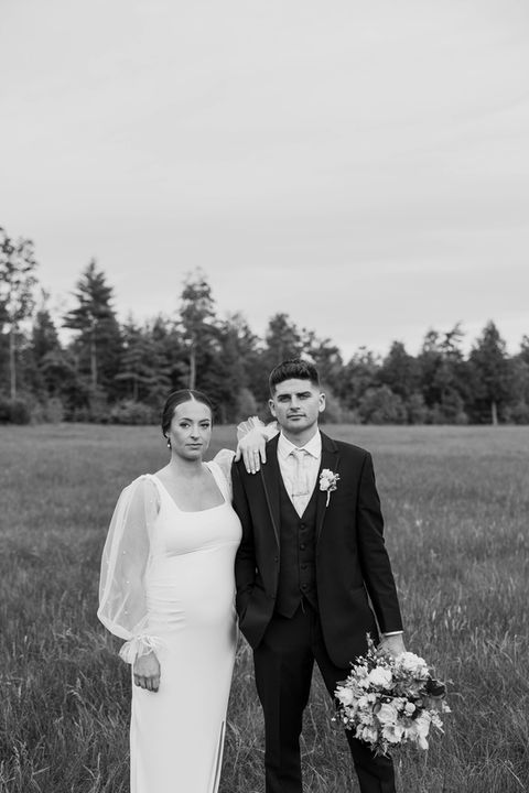 Their day started with private vows in front of the barn followed by a beautiful outdoor ceremony with lush white and blush florals. Their entire wedding design was elegant and clean. From the pearl inset details on the brides dress playing off the pearls on the linens, to the grooms custom tie clip, no detail was missed. They celebrated their love with 150 guests.