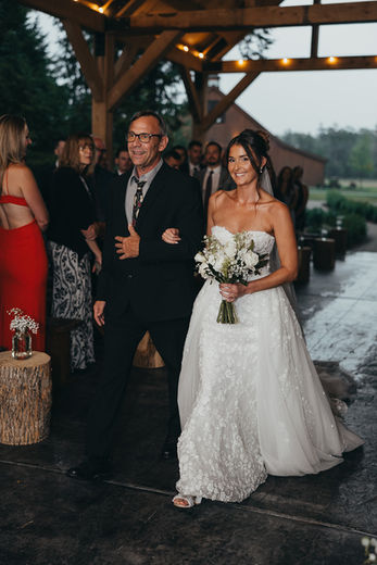 When the weather took a turn and the forecast suddenly called for tornado warnings Kristin's words were "Oh, I am walking through those damn arches!" We shifted the timeline to have all bride and groom portraits as well as wedding party photos complete prior to the rain setting in. Kristin and Michael got their moments under the arches and the ceremony was moved to the pavilion. The rain ended up being a perfect moody backdrop for the rich green, black, and brown tones utilized in their decor.